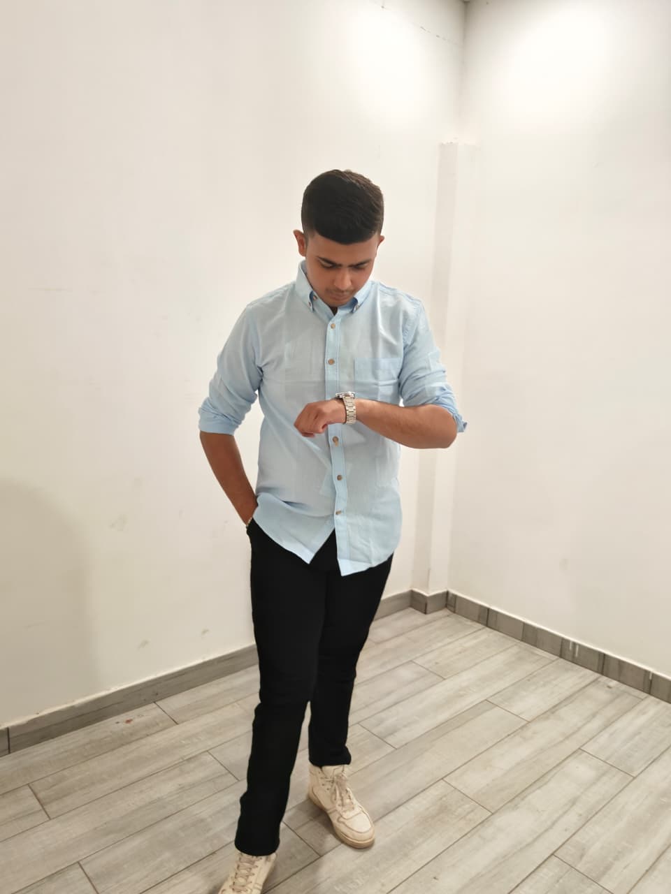 Beat the Heat in Effortless Style: Our Premium Linen Full-Sleeve Shirt. Experience the unparalleled comfort of our premium soft cotton-linen blend, designed to keep you cool and stylish all day long. This baby blue-colored shirt, with its luxurious woven texture, elevates your wardrobe with a touch of refined elegance. Pair it with formal trousers for a sharp office look, or chinos for a smart-casual vibe.